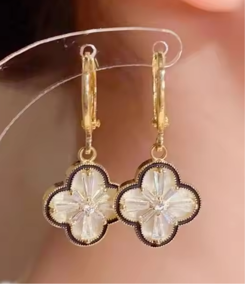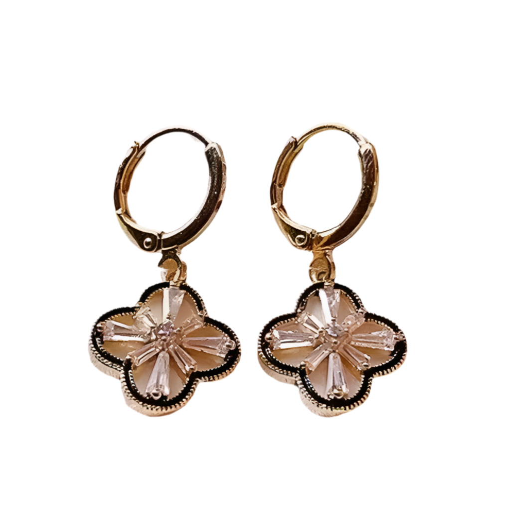 These Crystal Bloom Earrings feature a stunning clover flower design adorned with sparkling crystal zirconia in a beautiful gold color. Perfect for adding a touch of elegance to any outfit. Expertly crafted for a timeless look.