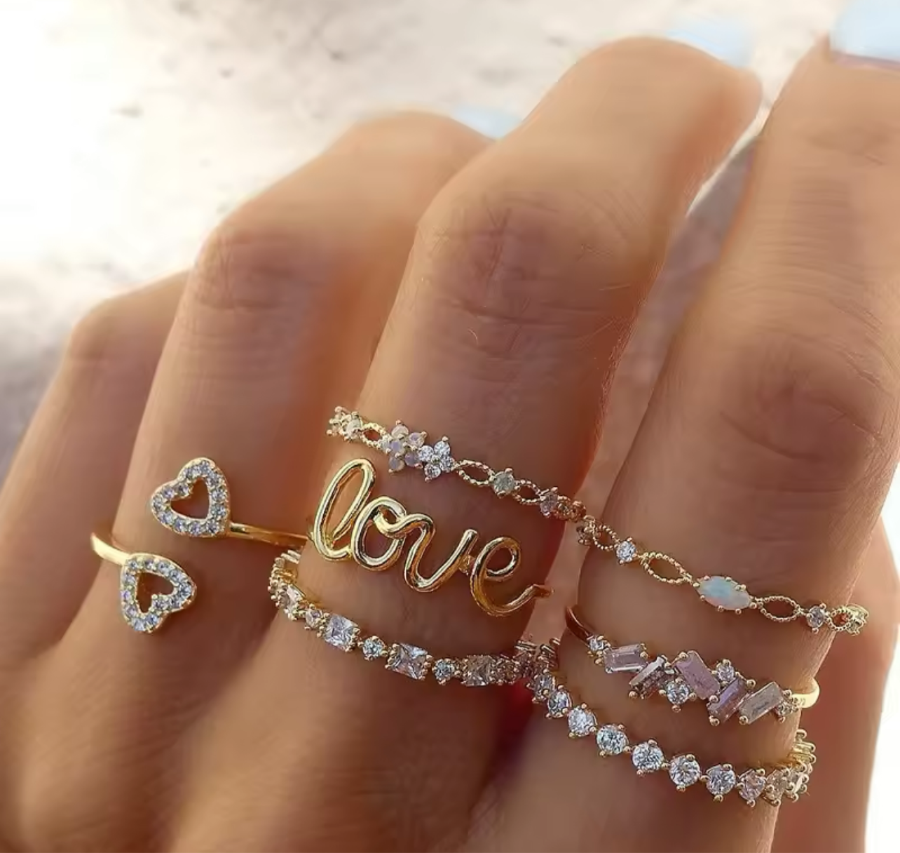 Crystal Rings set of 7 rings with the zircon stones bring a touch of sparkle. With various rings included, this set offers versatility and the perfect fit for size 7. Elevate any outfit with these stunning rings.