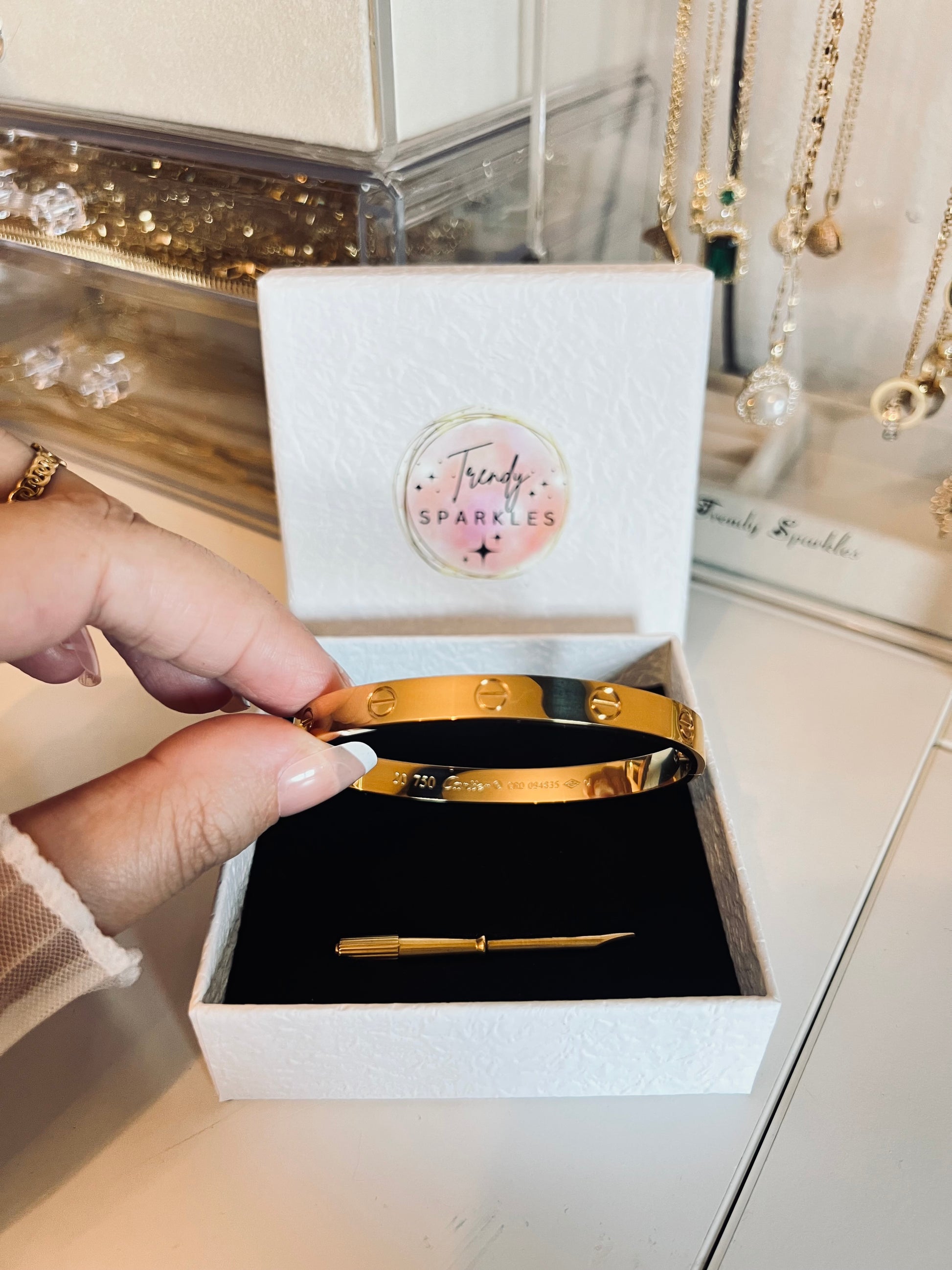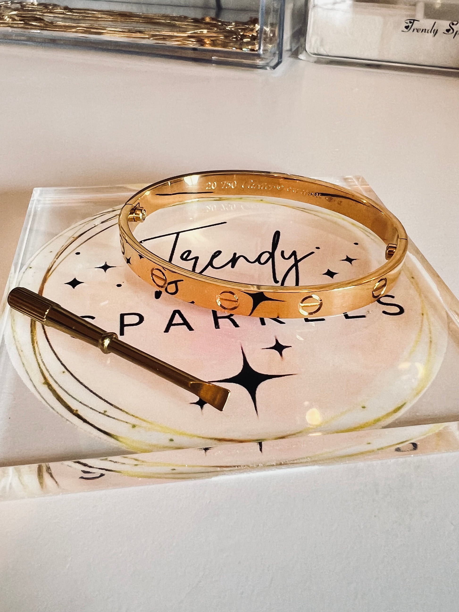 The famous Screw, Unscrew Bangle. Crafted with stainless steel and 18k Gold plating, this bangle features iconic screw motifs for a modern and edgy look. With its high-quality construction, you can wear it without worrying about tarnishing. Upgrade your wrist game with this stylish and durable piece.