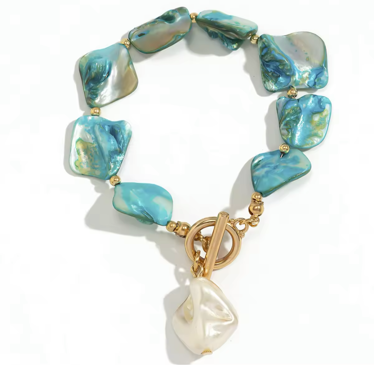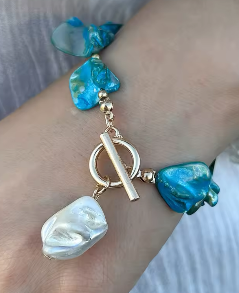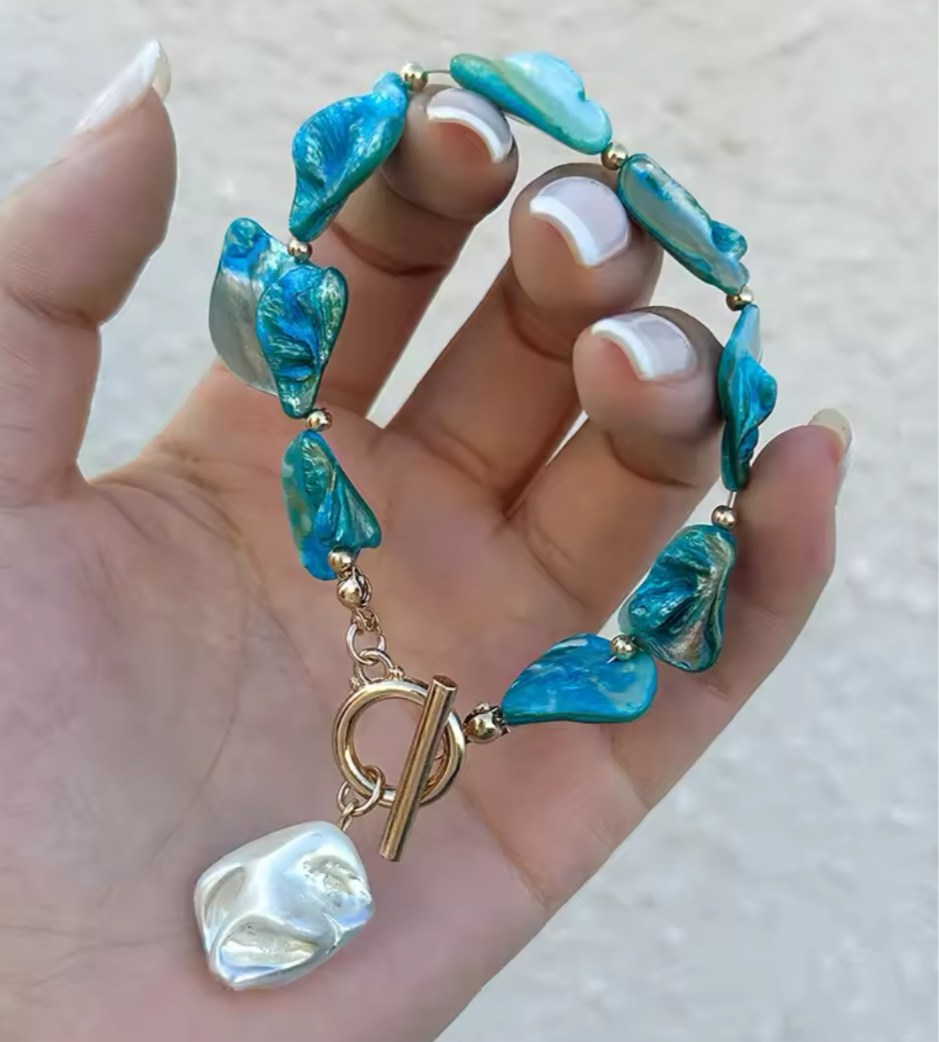 Crafted with 18K gold plated stainless steel and natural shell, the Seaside Pearl Bracelet is the perfect addition to your summer or holiday wardrobe. Its stunning Aqua color will elevate any day or night look.