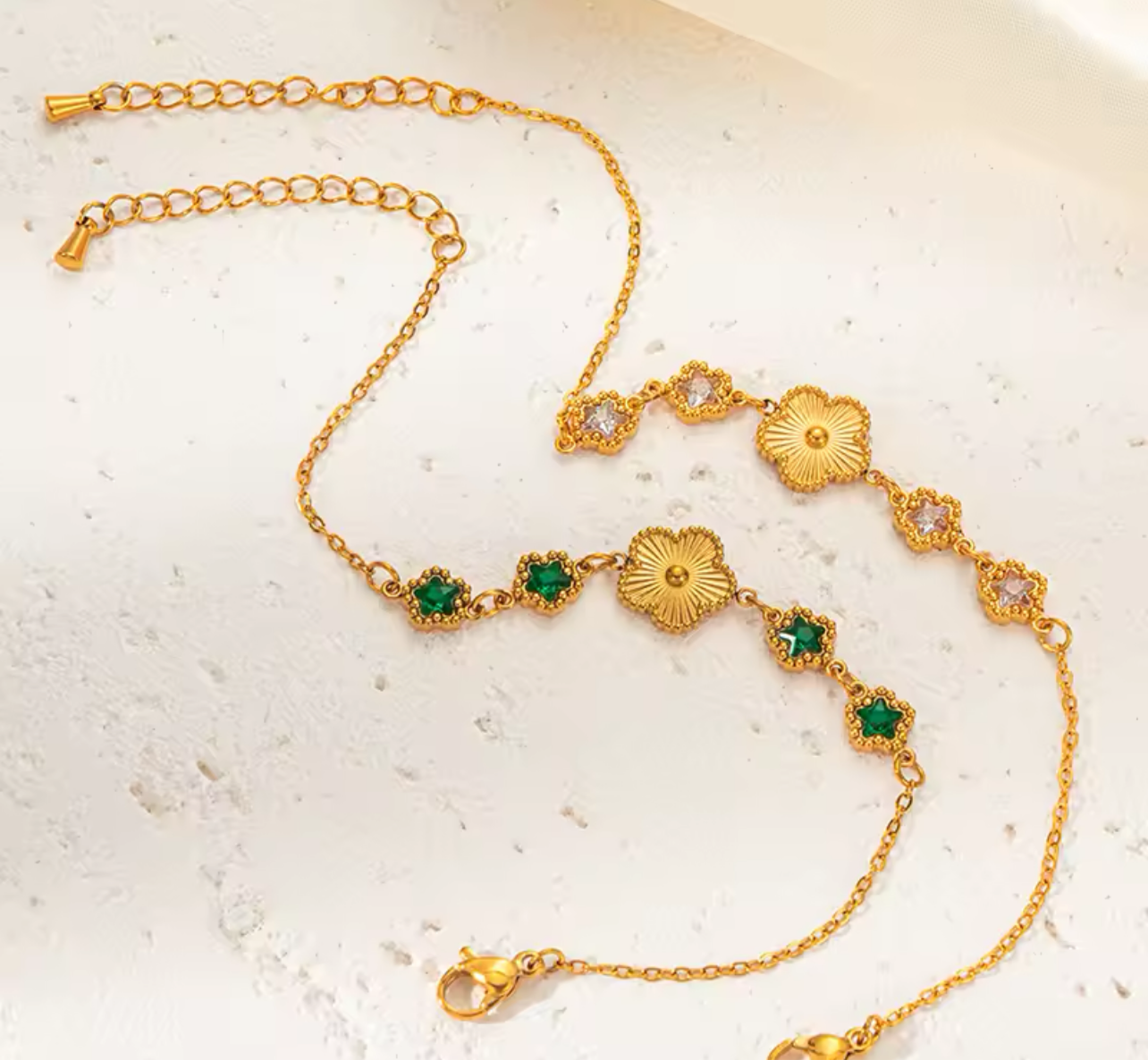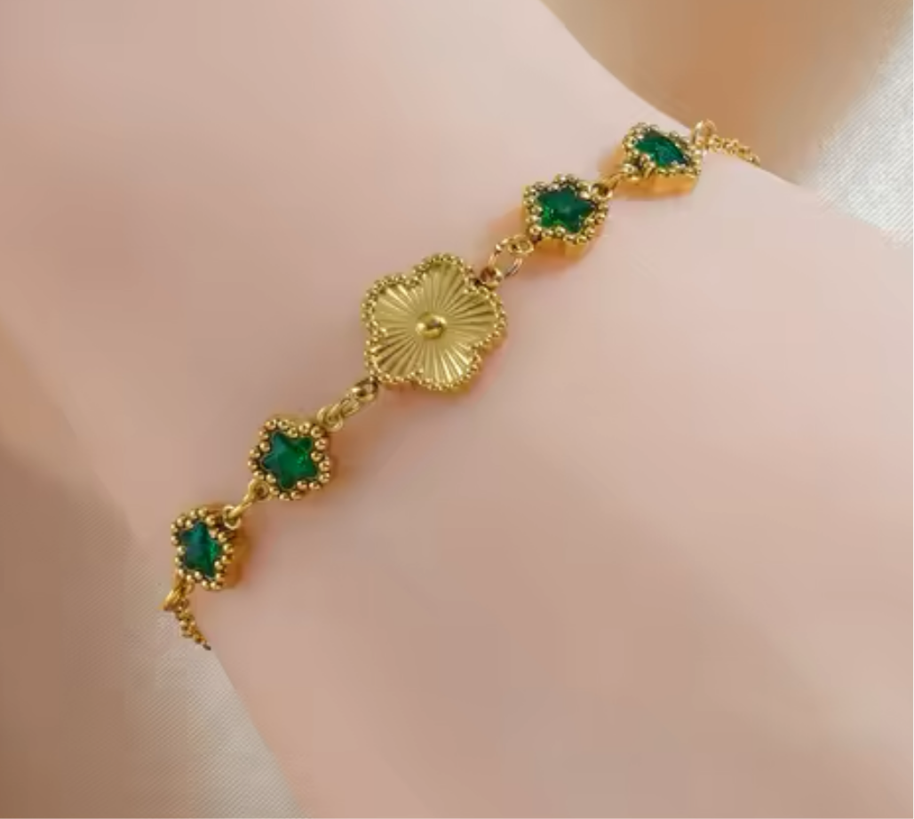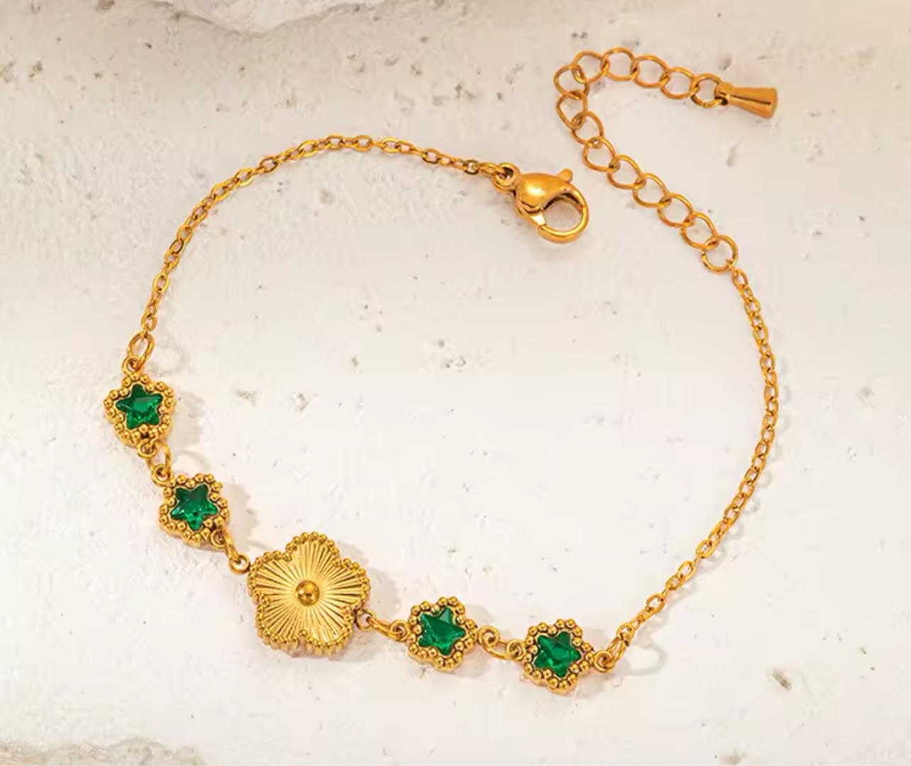 Expertly crafted with 316L stainless steel, this lucky flower bracelet is adorned with brilliant green zircon stones for an elegant touch. With its durable material and sparkling accents, it is the perfect addition to elevate any outfit. Handmade for a unique and precise design, this bracelet will bring luck to any occasion.