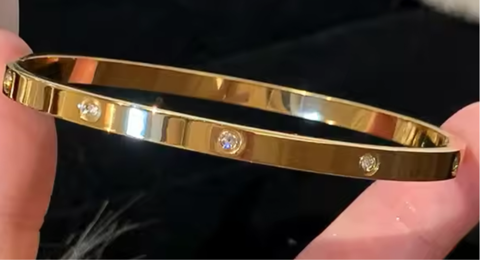 This titanium stainless steel bangle plated with 18K gold features sparkling zirconia, adding a touch of elegance to any outfit. The durable and high-quality materials make it a stylish addition to your jewelry collection. Upgrade your look with this beautiful zirconia bangle.